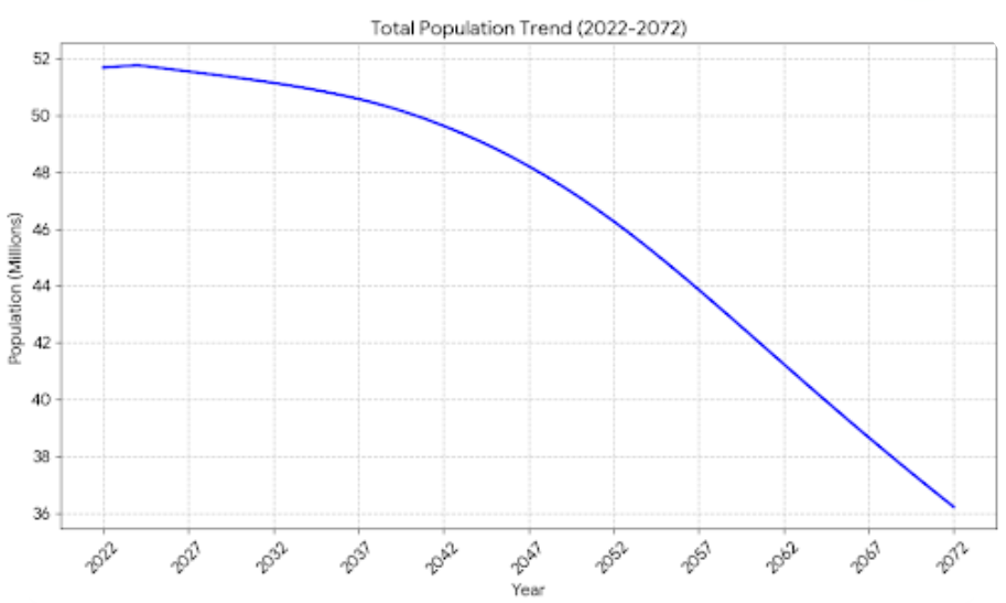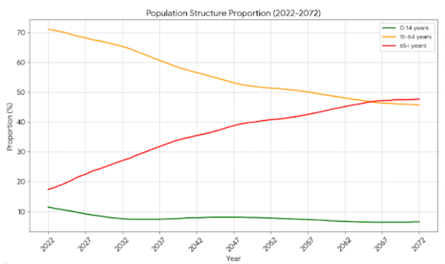 -인구 10명 중 4명(40.1%)이 65세 이상 고령자임. 국가 예산의 절대다수가 복지와 의료비로 편중될 수밖에 없는 극단적인 구조가 형성됨 - 2056년: 중위연령 60세 돌파