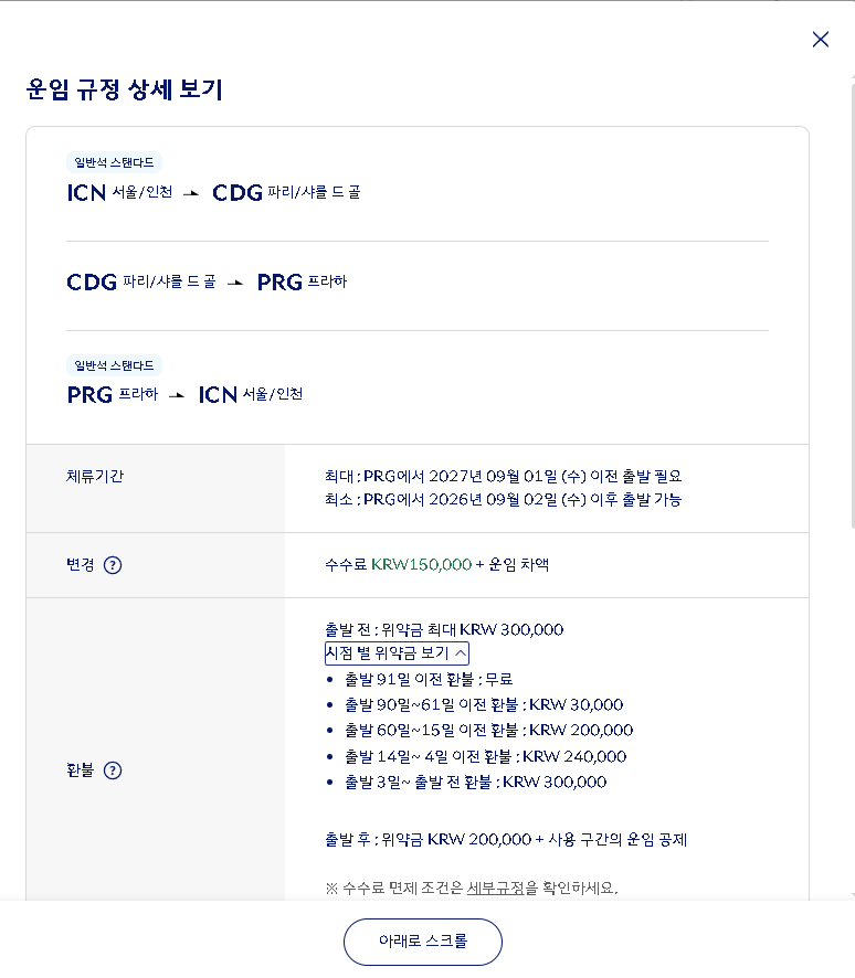 - 한국 출발 운임규정 사례 확인 (서울 - 파리, 파리 - 프라하 / 프라하 - 서울/인천 = 왕복)