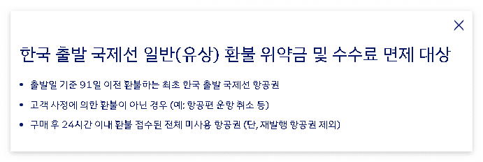 • 한국 외 출발 항공편은 각 운임 규정에 환불 수수료가 있음(출발 91일 이전 환불 무료 아님)