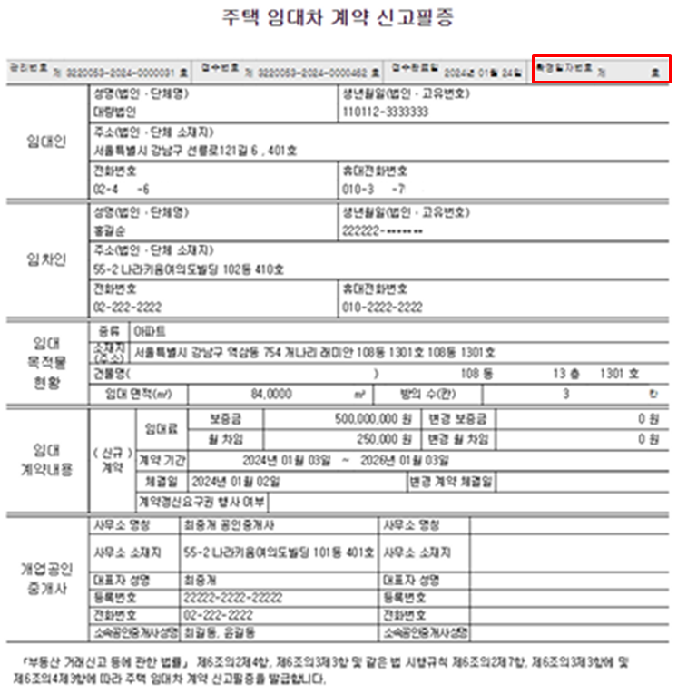 - 주택 임대차 계약 신고 후 주택 임대차 계약 신고필증을 수령하며, 해당 필증에 확정일자번호가 기재됨(우측 상단)
