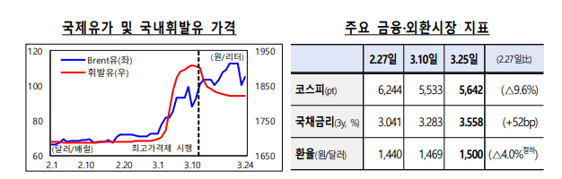 -국내석유제품 가격은 최고가격제 시행(3.13일~) 하락 다만, 국제유가 상승분이 시차를 두고 반영될 전망 - (시장) 주가는 상황 전보다 낮은 수준에서 등락 중이나 연초 대비 주요국보다 높은 상승률, 환율(원/달러), 금리는 큰 폭 상승