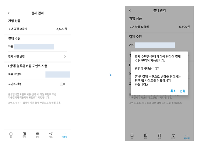 - 결제 정보 조회 및 변경 클릭 → 가입자 정보 확인 입력(생년월일, 이름, 핸드폰번호) → 차량 선택 후 결제 방법 변경하면 끝!