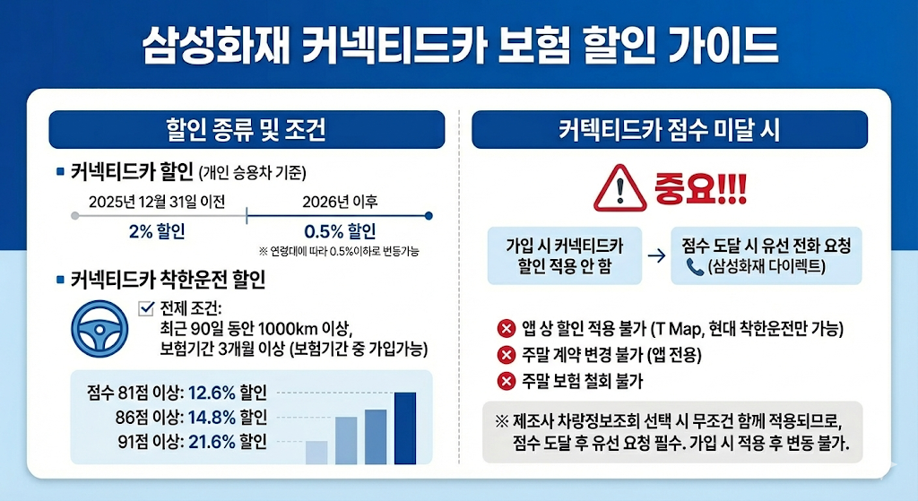 - 가입 시 커넥티드카 할인을 적용하지 않고, 점수 도달 시 유선상으로 삼성화재 다이렉트에 전화해서 할인 적용해야 함.