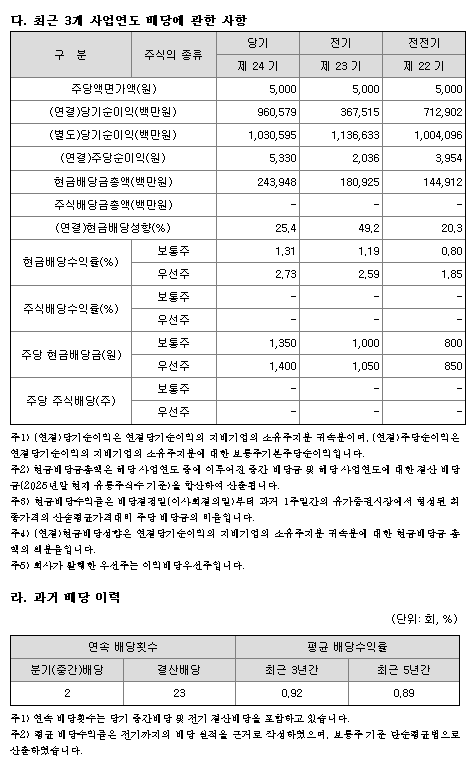 - 배당성향 상향: 24~26 연결재무제표 기준 당기 순이익의 25% 이상, 24년부터 중간배당도 실시하고 있으며, 1주당 연간 최소 1,000원 이상 주주에게 환원하기로 함.