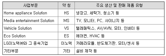 - 주요 사업 부문: 냉장고, 세탁기, 청소기 등을 생산 판매함