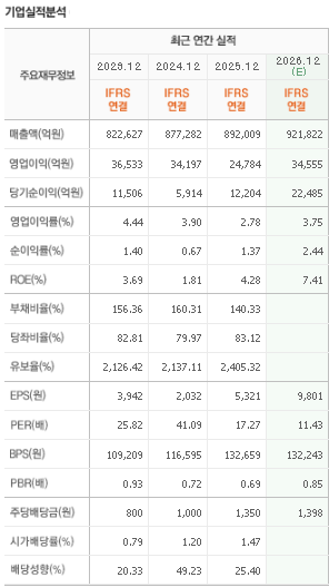 - 2023년 이후로 꾸준한 매출 증가 (`23년 82조 → `25년 89조) ※다만, 영업이익 & 당기순이익은 오르락내리락 이 있으며 순이익률 낮음 (10년 연속 성장세)